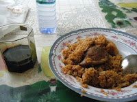 ガーナでは米もよく食べます。これは、トマトで煮込んだ焼き飯、ジョロフライスと、お赤飯のようなワチェ。