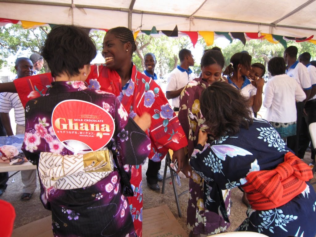 Event イベント よさこい♪ Yosakoi Japanese Festival Yoko Gocho 2009年11月19日 先週の土曜はアクラでよさこい祭りがありました! 晴天に恵まれ、たくさんのガーナ人&日本人のチームがそれぞれ元気いっぱい踊りました。 隊員の配属先の生徒や、JICAのスタッフさんたちも参加されました。 隊員は、たこやきや、やきそば、ヨーヨーつりなどのお祭りコーナーを担当しました。 私たちは、浴衣の着付け体験コーナーを担当しました。 みんなとっても嬉しそう☆ 最後にいつもお世話になっているNGOのボランティアと一枚☆パチリ☆ とっても暑かったけど、楽しい一日でした!