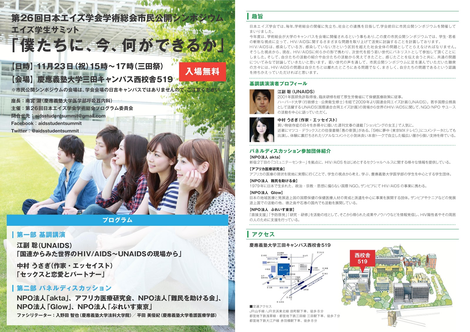 今年度は、学術総会が大学のキャンパスを会場に開催されるという事もあり、この度の市民公開シンポジウムでは、 学生・若者の斬新な視点に立って、HIV/ AIDSに関する様々な問題を取り上げて活発に討論するこ とを計画しております。