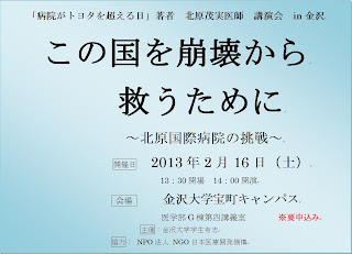 「世のため人のため、より良い医療をより安く」「日本の医療を輸出産業に育てる」という理念を掲げ、日本を医療崩壊から救う試みを実施しながら、カンボジアの医療供給体制の立て直しや、東北の復興に奔走している北原茂実医師を金沢にお招きして、講演会を開催致します。